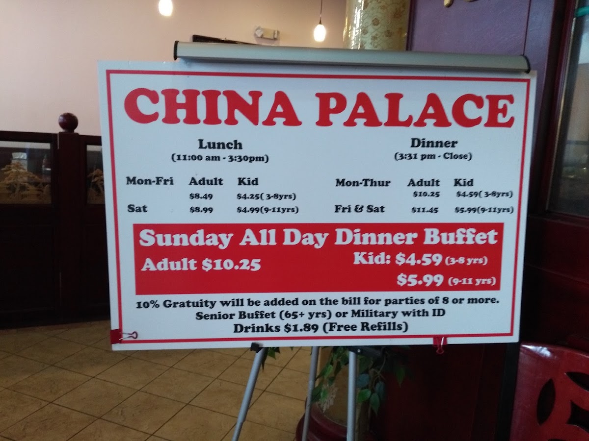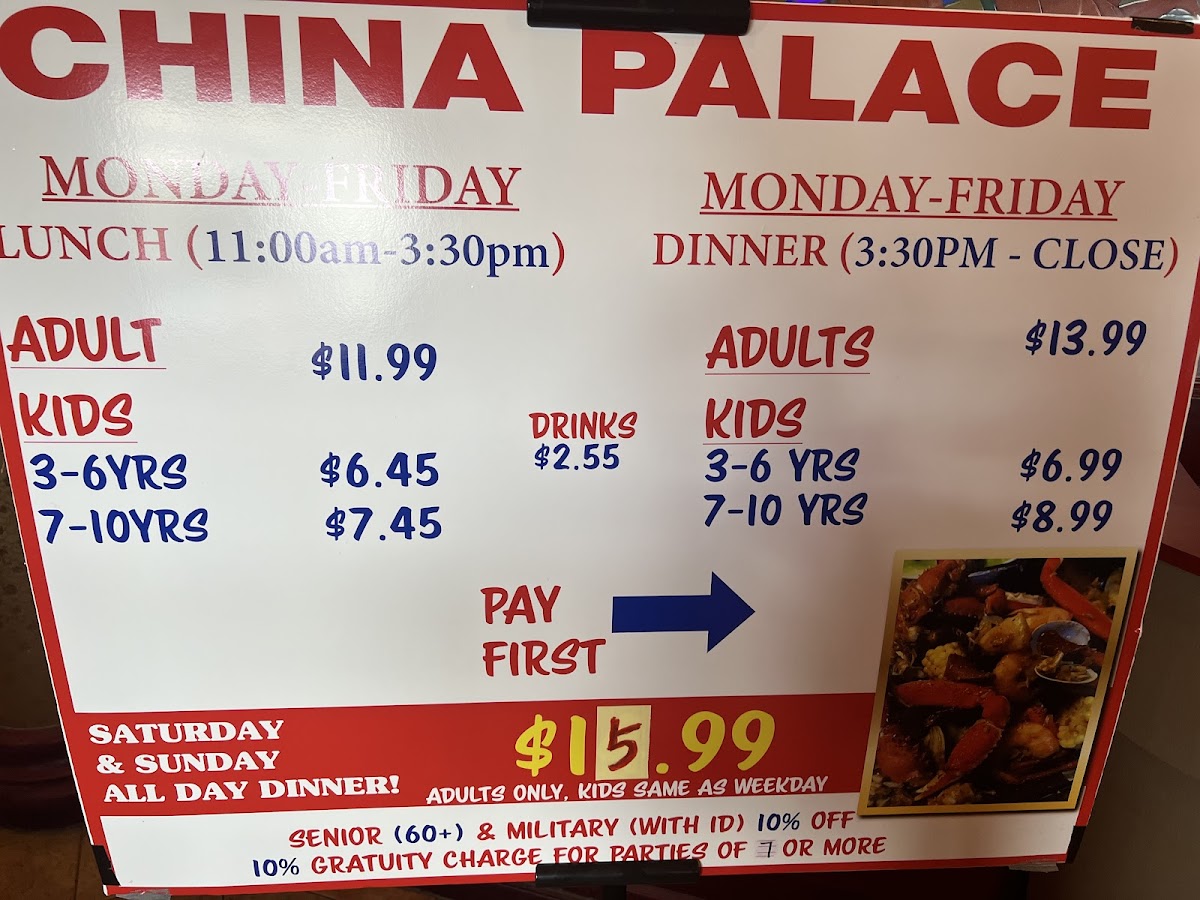 The buffet menu also highlights a selection of seafood items like crab legs, baked fish, and squid alongside popular dishes such as fried wontons, egg rolls, chicken fried rice, sesame chicken, lemon chicken, and hot and sour soup. Fresh fruit and fruit salad are also available for a lighter option.