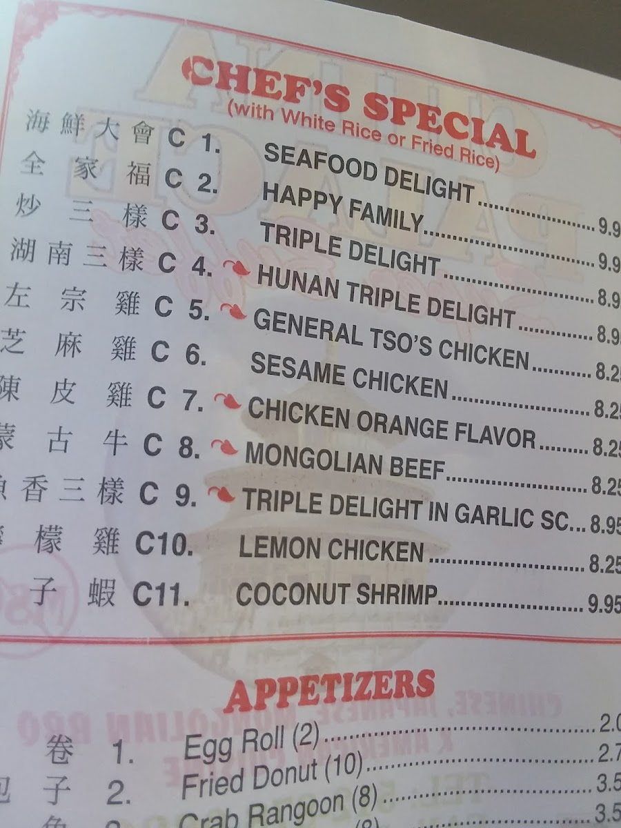 In addition to the classic Chinese dishes, the menu includes a range of sushi rolls such as Vegetarian, Alaska, Philadelphia, Cucumber, Salmon, Shrimp, Tuna, Avocado, and California rolls. This variety provides options for different preferences and includes both seafood and vegetarian choices.
